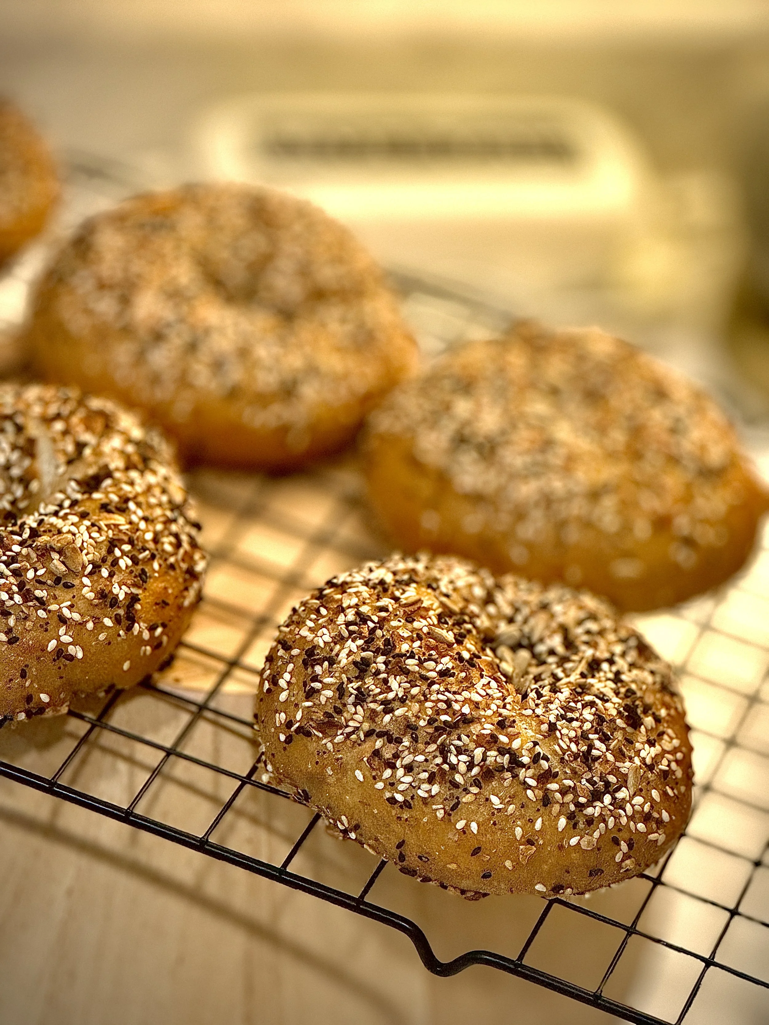 ThisEverything Bagel is covered with light and toasted sesame seeds, poppy seeds, sunflower seeds, and highlighted with onion flakes, regular and black garlic, a touch of nutritional yeast for a deep umami flavor spiced with smoked paprika! A light dusting of rosemary-lemon salt sends this bagel around the world! Perfect just by itself or used for a sandwich. Unlike any Everything bagel you've ever tasted!